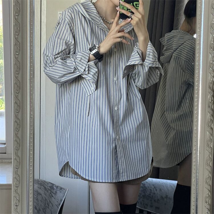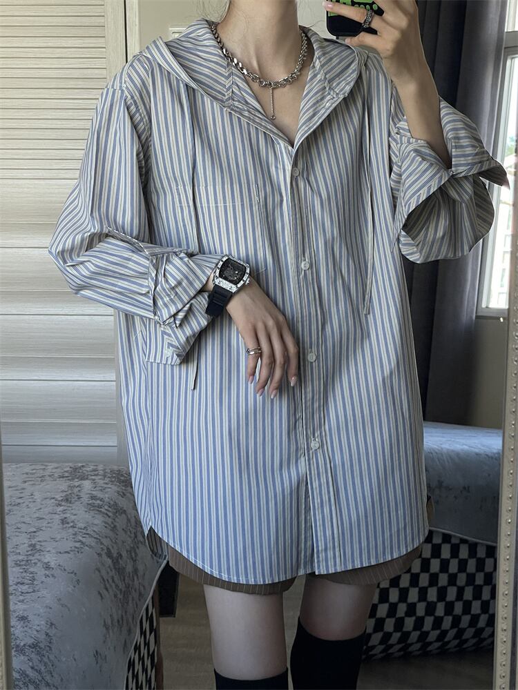 セットアップ スリム ストライプ フード付き シャツ エレガント アメリカン トップス